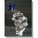 Réalisation d une main en verre transparent avec un papillon en verre bleu posé sur un socle
